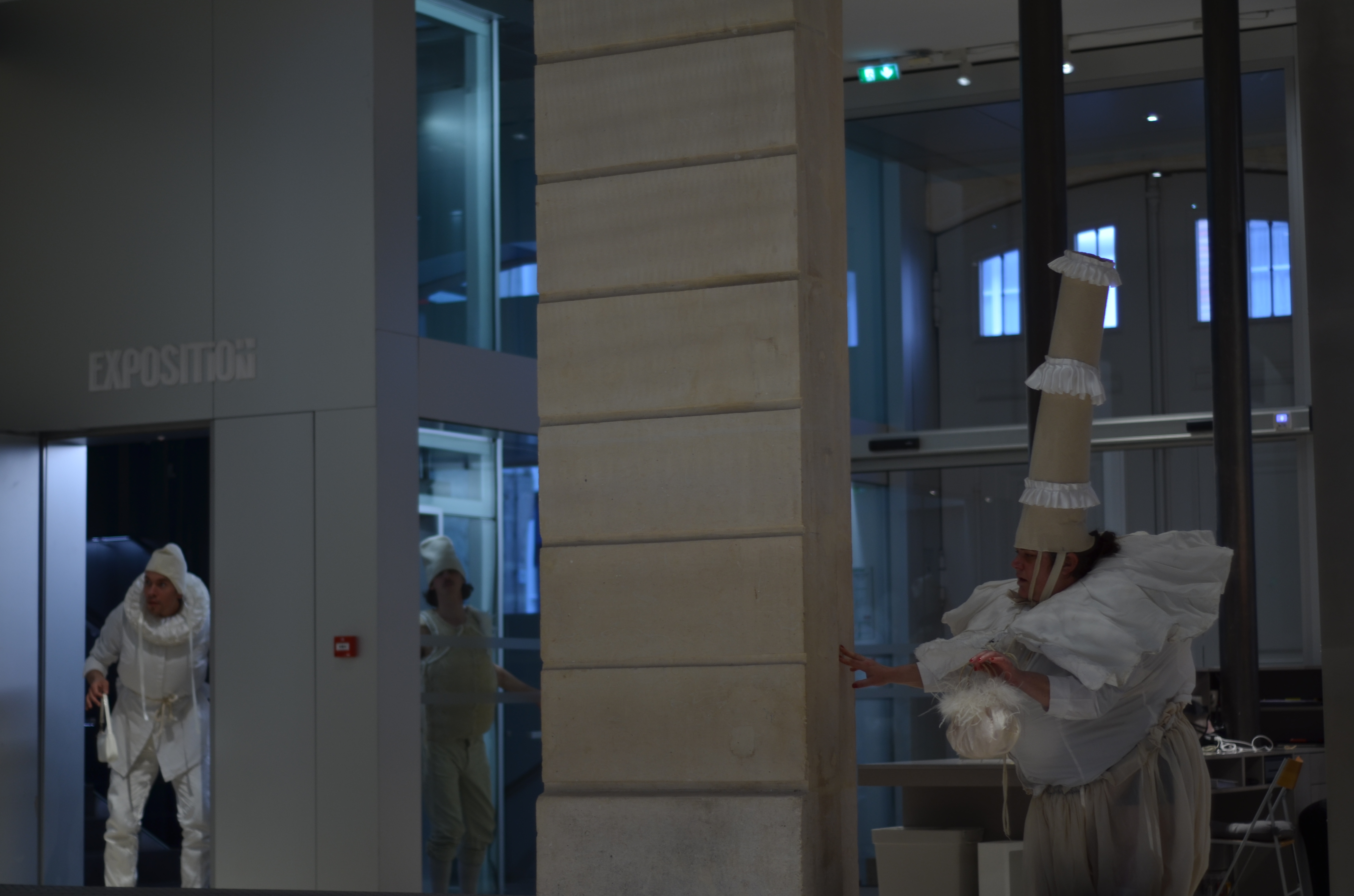 Il s’agit donc de donner à voir une de ces hordes de Polichinelles sauvages – de Poliches. Comme une espèce, une communauté, une micro-société à la forme de vie singulière. En gardant à l’esprit la force du lien qui existe entre un habitus animal et une morphologie, la forme d’un corps : Poliche, séducteur difforme, est avant tout caractérisé par ses deux bosses grotesques et son chapeau turgescent de haut-dignitaire pontifical. Mais l’important n’est bien sûr pas tant ce que Poliche a, ce dont la nature l’a doté, que ce qu’il en fait : c’est en imaginant les façons dont il joue du corps qui est le sien, dont il fait théâtre de ses attributs, comme un oiseau exhibe ses ailes ou comme un homme montre ses muscles, somme toute, les façons dont il parade, que l’on se rapprochera de la spectacularité animale.